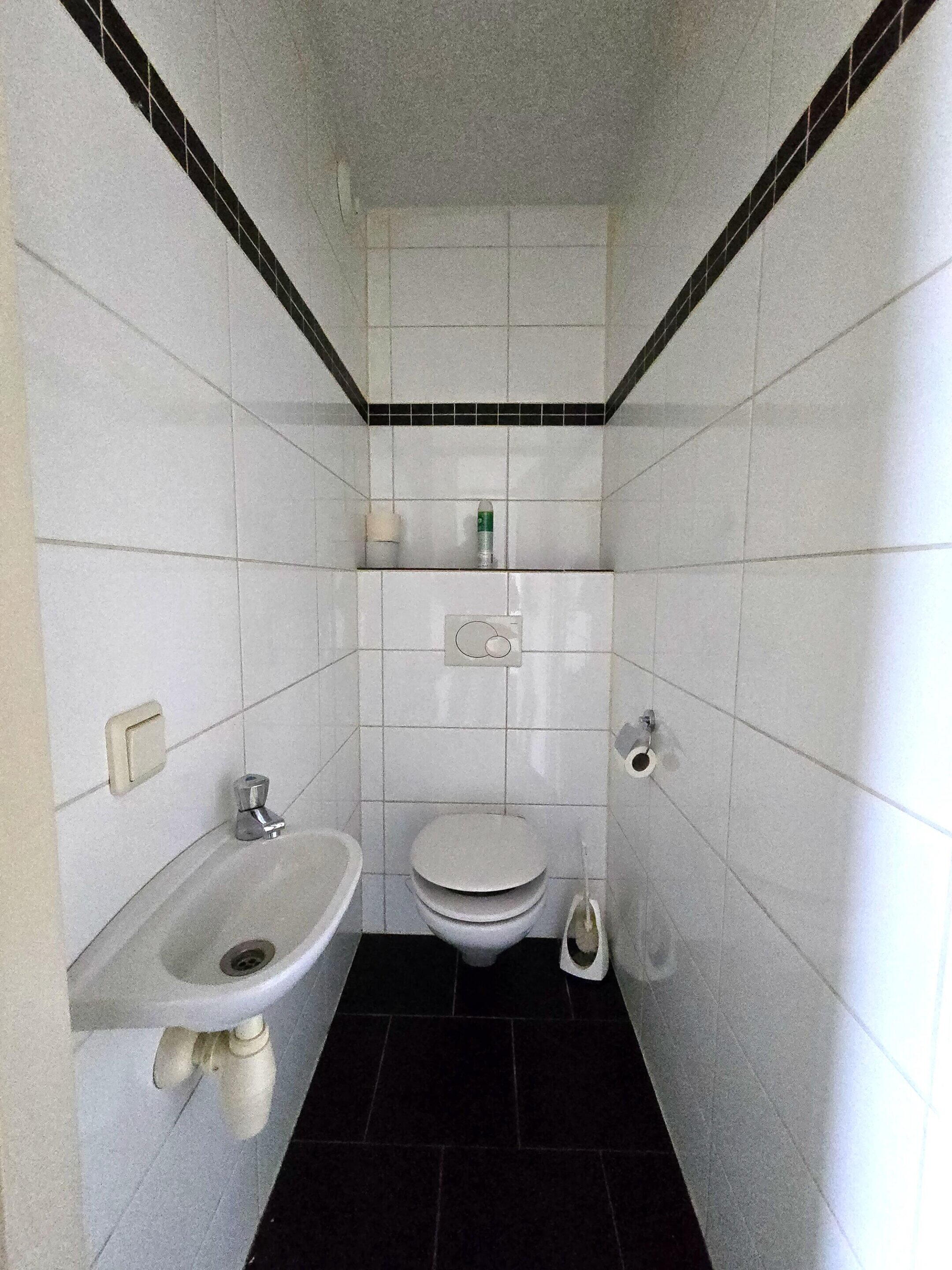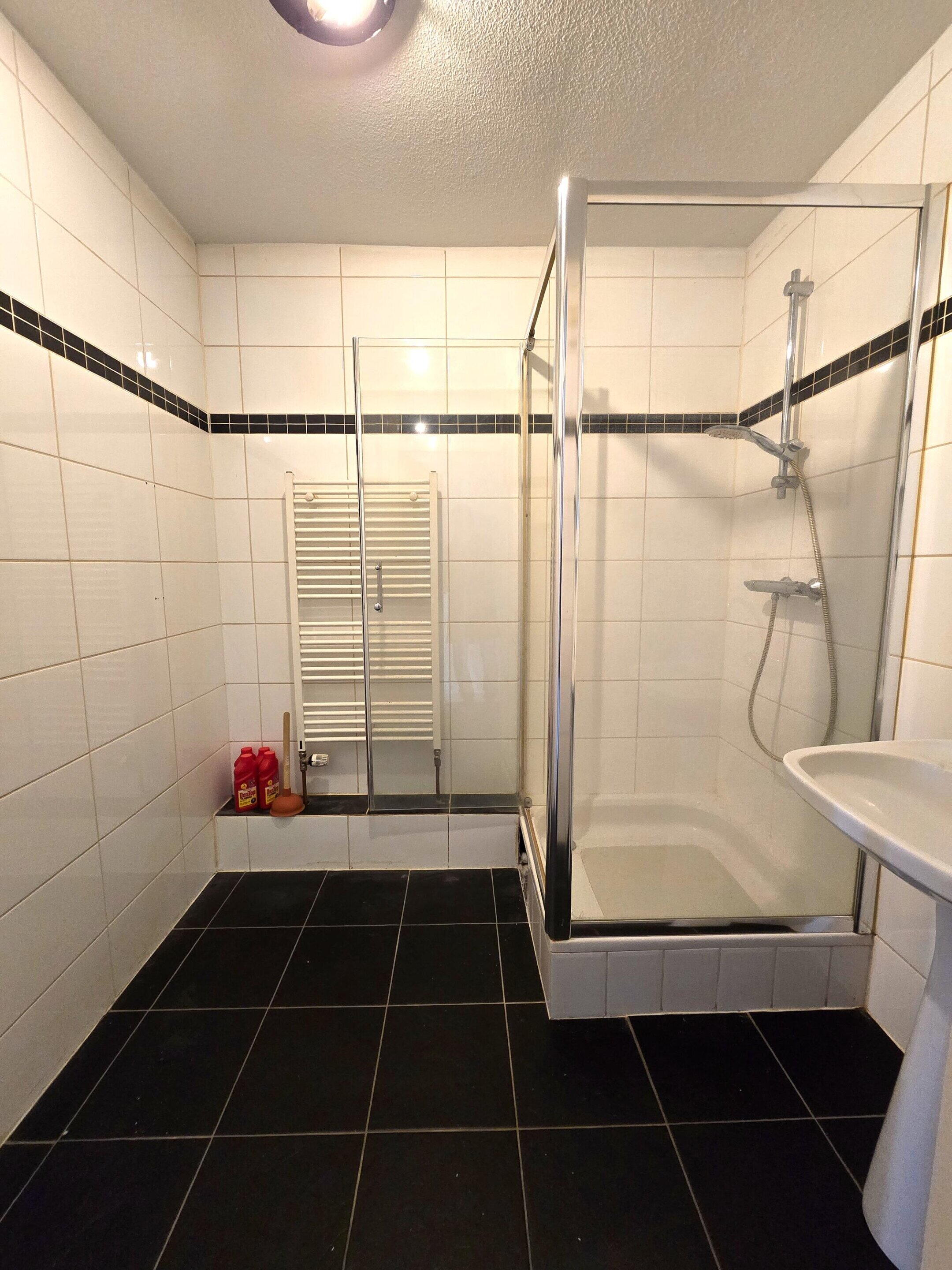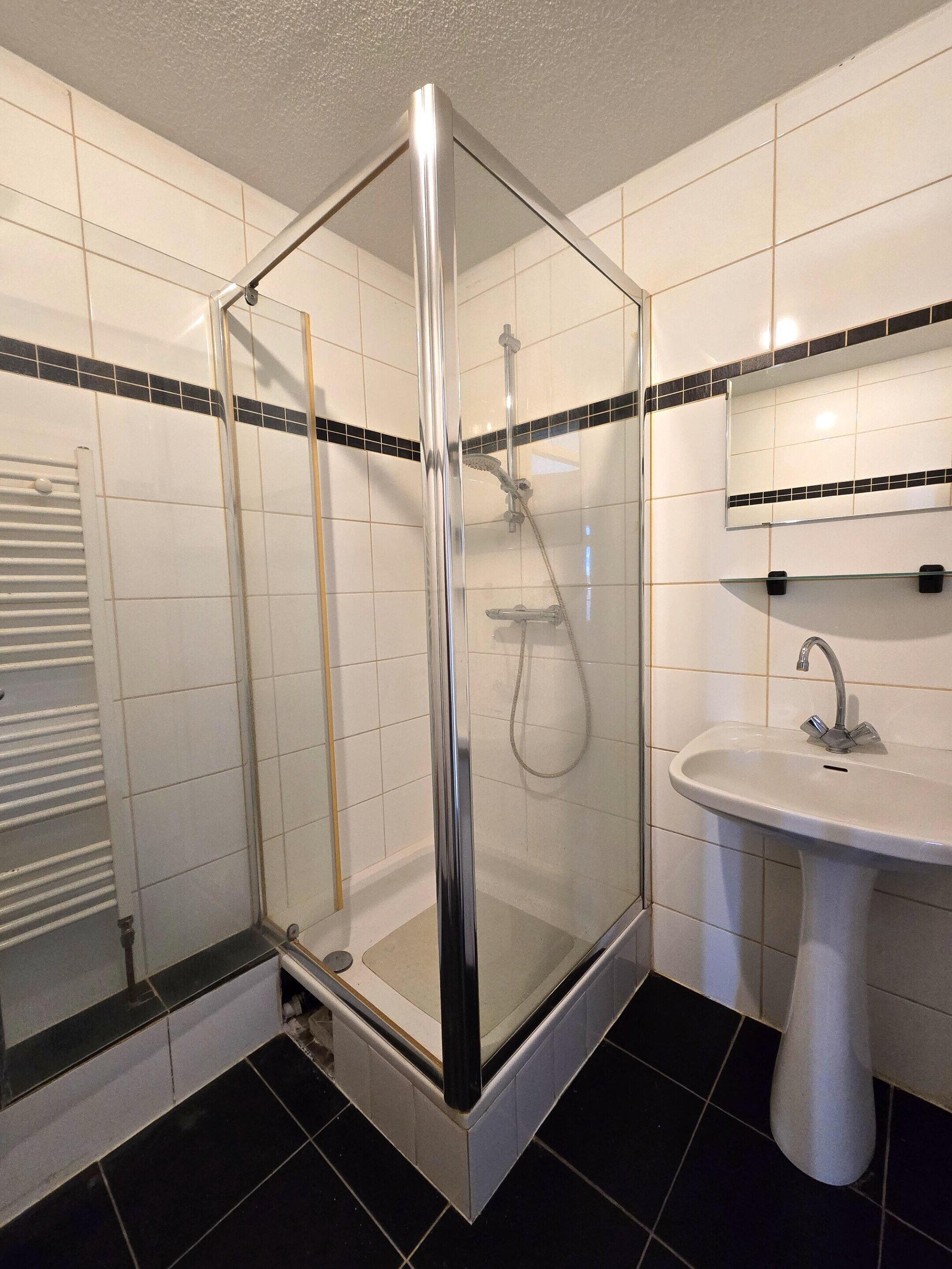 De betegelde badkamer is op zich nog prima, alleen vanwege een oude lekkage die ondertussen is verholpen, ontbreekt er 1 tegel bij de doucherand. Met ca. 4 m² is er in ieder geval voldoende ruimte voor de aanwezige douche en wastafel, zeker omdat de wasmachine in de naastgelegen ruimte geplaatst kan worden en het toilet separaat op de gang is.