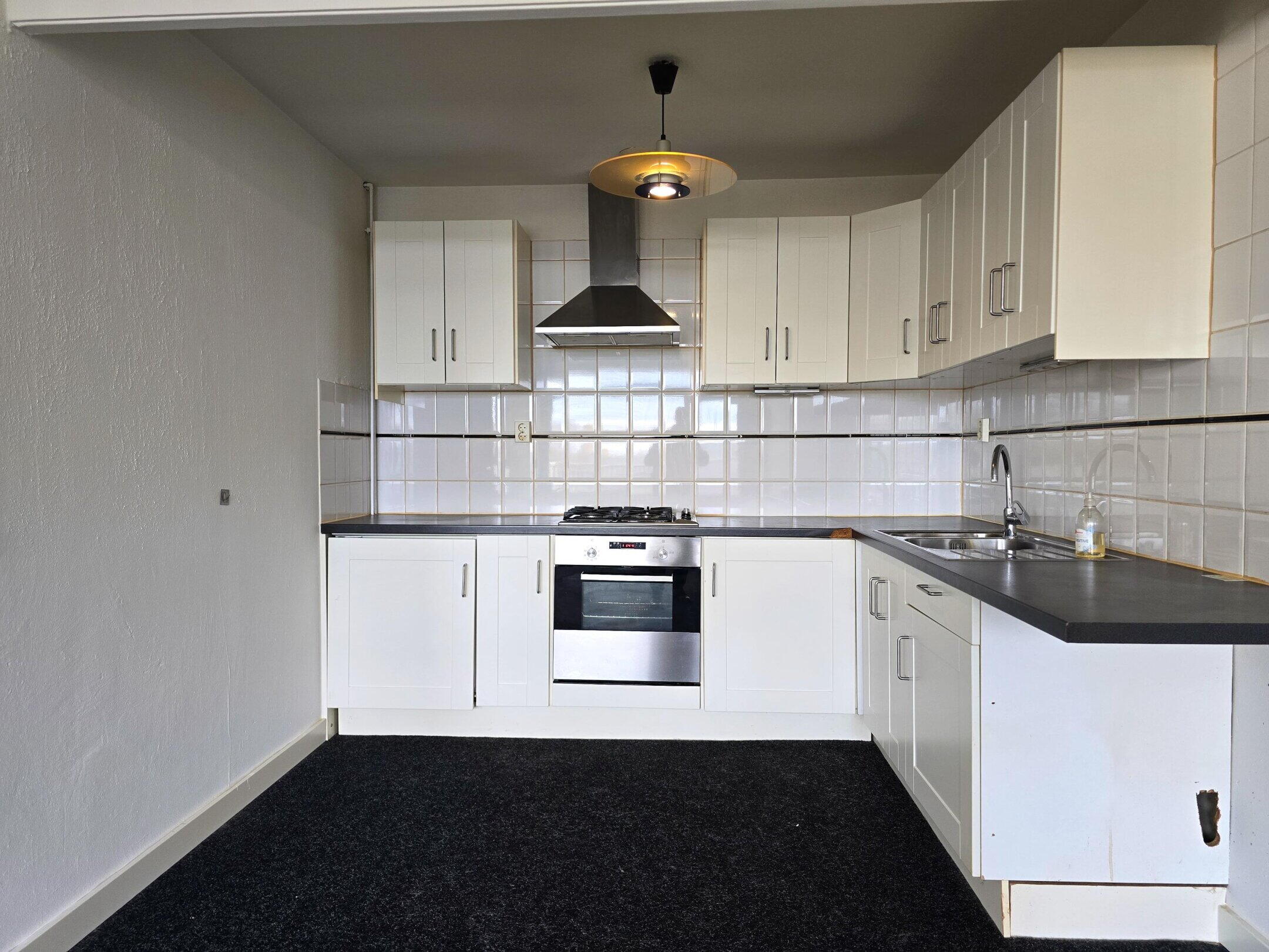 De open keuken is voorzien van een hoekopstelling met diverse apparatuur, o.a. 4-pits gaskookplaat, inbouwoven, inbouw koelkast en spoelbak en een groot werkblad (zichtbare beschadiging aan voorzijde).
